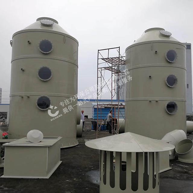 可采用涂裝線漆霧廢氣預處理凈化裝置,pp噴淋塔,漆霧在廢氣中呈懸浮狀,當其通過pp噴淋塔時(此時廢氣在管道中的流速約為8.2m/s),在高速噴射而出的噴淋水作用下,旋轉的噴頭(噴頭的旋轉速度取決于水量與壓頭),在水力作用下而產生的傘形狀旋轉水幕與漆霧充分混合,使原本懸浮于氣體中的漆霧相互碰撞,并迅速增重,最終達到漆霧-廢氣分離的目的,并可使VOC濃度減少50-80%,大幅度減少異味。失去黏性的漆渣進入噴臺循環水里,定期打撈固廢。